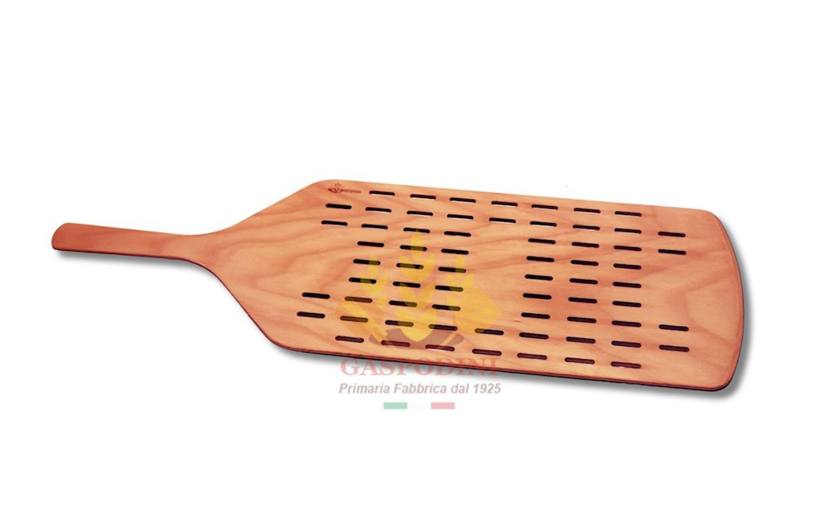 Che tu sia un professionista del settore o un appassionato di bakery, questa pala è lo strumento essenziale per sfornare pizze e focacce al metro. Realizzata artigianalmente in multistrato di faggio evaporato, che le conferisce un'eccezionale resistenza alle flessioni senza compromettere la sua leggerezza e robustezza. L'impugnatura ergonomica da 33cm offre una presa comoda e sicura, garantendo un controllo preciso durante la cottura. Le asole permettono di ridurre l'eccesso di farina nel forno fino al 60%, eliminando alla radice il problema della base bruciata. Grazie al trattamento di finissaggio standard la pala risulta impermeabile, inodore e altamente resistente alle macchie, garantendo una lunga durata e facilitando la pulizia. DIMENSIONE TOTALE: 90x30cm DIMENSIONE UTILE: 60x30cm PESO: 0,75 Kg * Se hai necessità di ricevere un articolo con dimensioni o design personalizzato inviaci un email con tutte le informazioni necessarie a commerciale@gaspodini.it